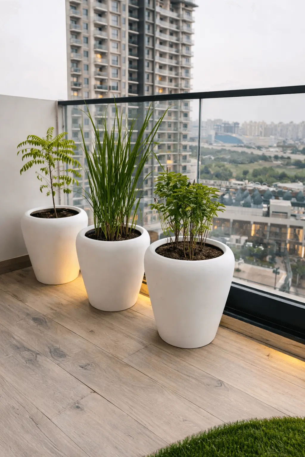 Rising above the dynamic skyline of M3M Skycity, this balcony makeover is envisioned as a tranquil yet luxurious outdoor haven. A customized backdrop integrated with a sleek AC cover ensures visual continuity by concealing utilities while introducing architectural depth. At the heart of the design, a calming Buddha fountain creates a soothing focal point, with the gentle flow of water enhancing serenity and sensory balance. Lush plants styled in premium planters add structured greenery, softening the layout while elevating the aesthetic appeal. A textured layer of river pebbles grounds the design with natural contrast, while a defined pebble border neatly frames the zoning of the space. Underfoot, artificial grass delivers a garden-like softness with effortless maintenance. Vertical styling through wall décor paired with integrated planters transforms blank walls into living art, adding dimension and curated elegance.